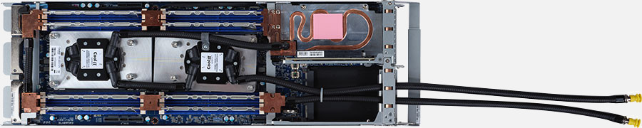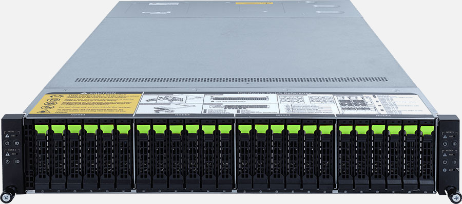 Quad Node, Liquid cooling solution, Dual AMD EPYC 7003 Series Processor, Redundant 2200W Power Supply, 24x 2.5" NVMe/SATA hot-swappable drive bays (6x Per node).