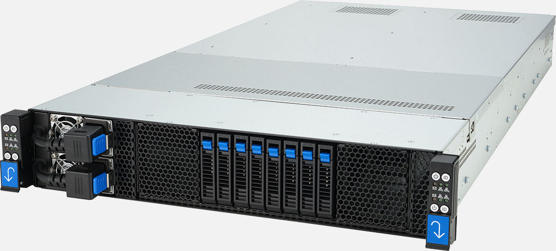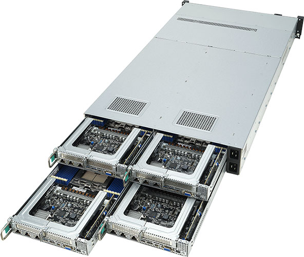 Quad Node, Dual AMD EPYC 9004 Series Processors, Dual 2600W redundant power supply, 8x 2.5" NVMe/SATA/SAS hot-swappable drive bays (2x Per Node).