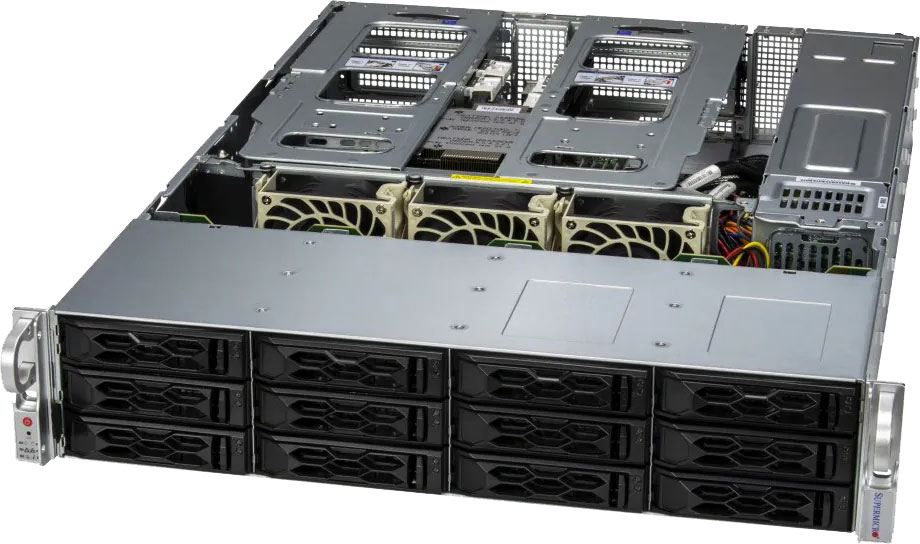 Single AMD EPYC 9454P Processor, 768GB RAM, 2x 960GB M.2 NVMe, Supports up to 2x FHFL PCIe Gen5 x16 slots - 8x 3.5" SATA & 4x SATA/NVMe Hybrid hot-swap drive bays.