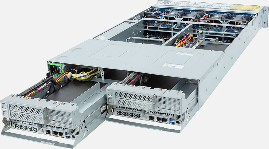 Dual Node, Dual AMD EPYC 9004 series processor(Per Node), Supports up to 4x Dual slot GPU cards, 4x 1Gb/s LAN ports (Intel® I350-AM2), 2600W Redundant Power Supply, 4x 2.5" NVMe hot-swappable drive bays.