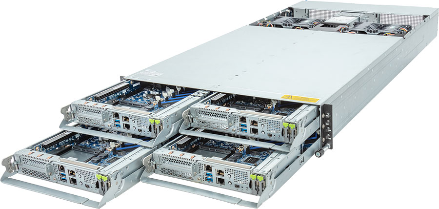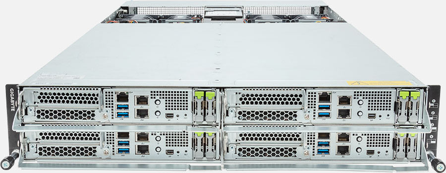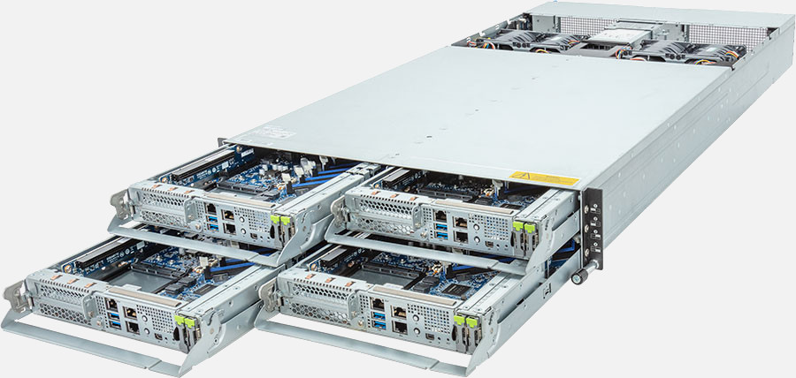 Quad Node, Single AMD EPYC 9004 series processor(Per Node), 4x LP PCIe Gen5 x16 slots, 8x 1Gb/s LAN ports (Intel® I350-AM2), 3000W Redundant Power Supply, 8x E1.S Gen4 NVMe hot-swappable bays