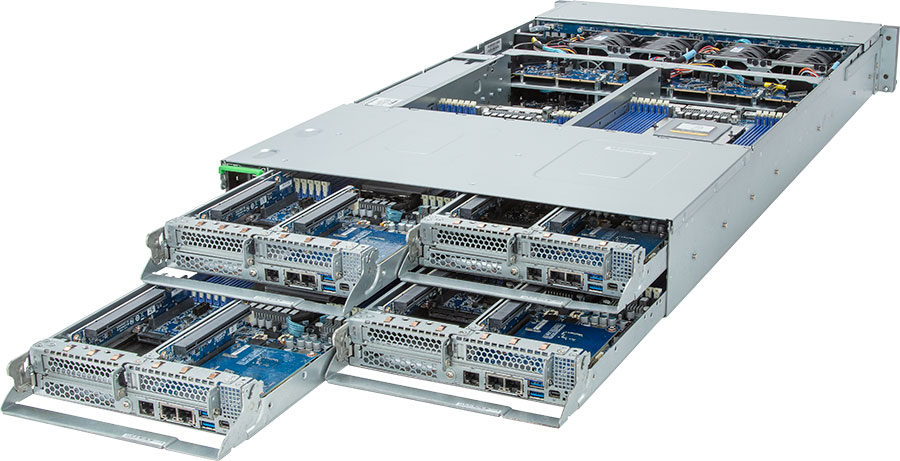 Quad Node, Dual AMD EPYC 9004 series processor(Per Node), 4x LP PCIe Gen5 x16 slots, 8x 1Gb/s LAN ports (Intel® I350-AM2), 3000W Redundant Power Supply, 8x NVMe/SATA/SAS hot-swappable bays.