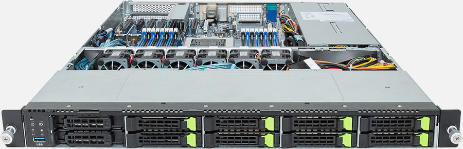 Single Ampere® Altra series processors, 1x FHHL PCIe Gen4 x16 slot, 2x 1Gb/s LAN ports (Intel® I350-AM2), 1100W redundant power supply, 8x 2.5" NVMe hot-swappable drive bays.
