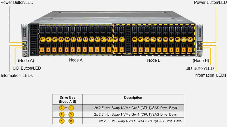 Ideal for Hyperconverged Infrastructure, Storage Area Network, and All-Flash Object Storage. Dual Node 2U Form Factor. Redundant 2200W Power Supply, 12x 2.5" hot-swap NVMe/SAS drive bays (Per Node)