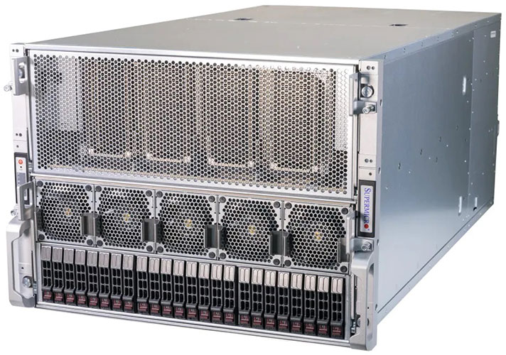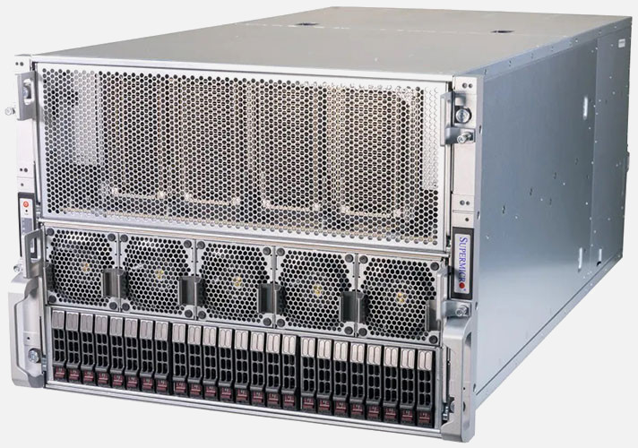 A 8U Supermicro SuperServer based on 2x AMD AMD EPYC 9004 Series range of processors, the Supermicro GPU A+ Server 8125GS-TNHR | AS-8125GS-TNHR is configurable with up to 24x Hot-Swap Drives drive bays, and designed for optimal performance with 24x 4800Mhz DDR5 memory sockets .