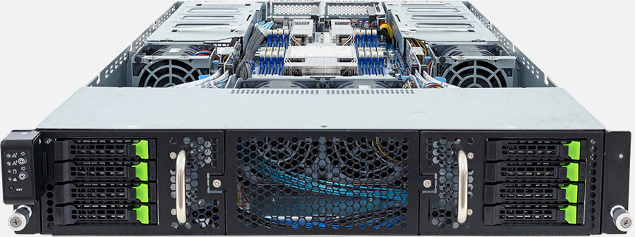 Dual 4th Gen Intel Xeon Scalable Processors, Supports up to 4x dual slot GPU cards, 2x 10Gb/s BASE-T LAN ports (Broadcom® BCM57416), 8x 2.5" NVMe/SATA/SAS hot-swappable drive bays.