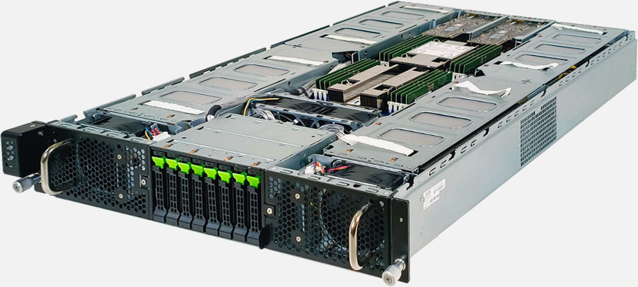 Dual 4th/5th Gen Intel Xeon Scalable Processors, NVIDIA OVX™ L40S Server with 4 GPUs, 2x 10Gb/s BASE-T LAN ports (Broadcom® BCM57416), 8x 2.5" NVMe/SATA hot-swappable drive bays.