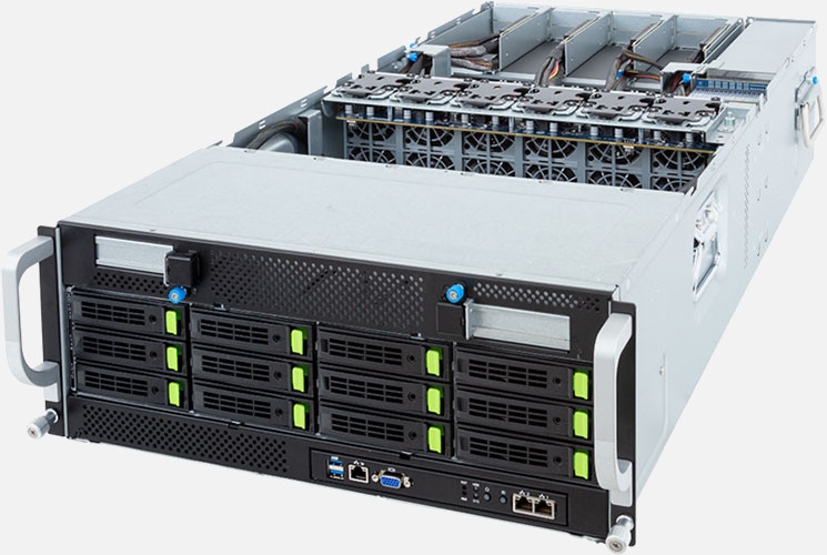Dual 4th Gen Intel Xeon Scalable Processors, Supports up to 8x double slot GPU cards and 10x PCIe Gen5 x16 (LP) Slots, 2x 10Gb/s BASE-T LAN ports (Intel® X710-AT2), 12x 3.5"/2.5" SATA/SAS/NVMe hot-swappable drive bays.