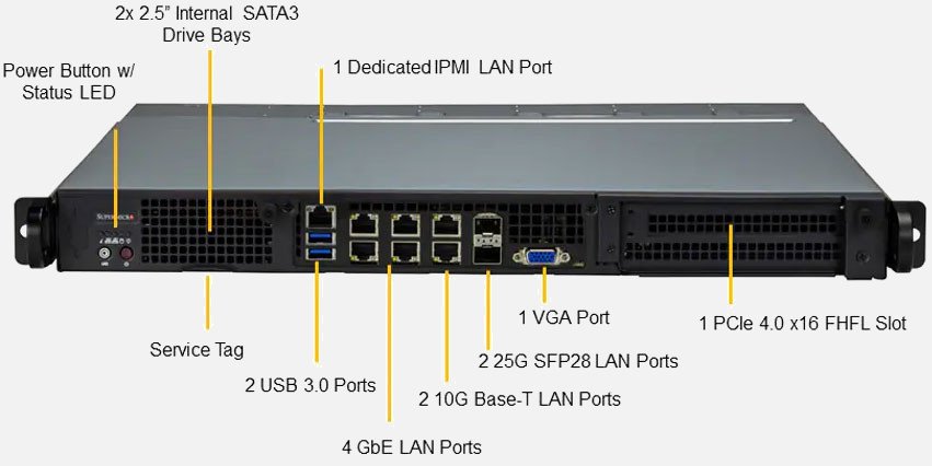 The Supermicro IoT SuperServer 110D-4C-FRAN8TP | SYS-110D-4C-FRAN8TP supports the family in a high-density 1U form-factor. These SuperServers are ideal for network infrastructure, front-end enterprise, and minimal-downtime cluster server systems.