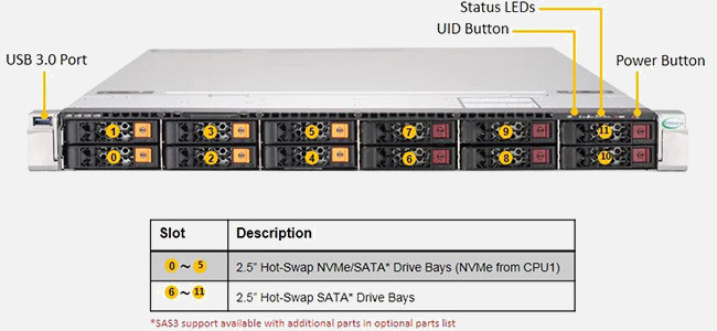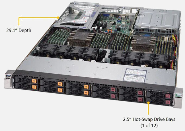 The Supermicro SuperServer 1029U-TN12RV-NEBS | SYS-1029U-TN12RV-NEBS can be configured with 2.5" drives, a more space efficient and low noise option. These drives also offer energy savings and increased flexibility.
