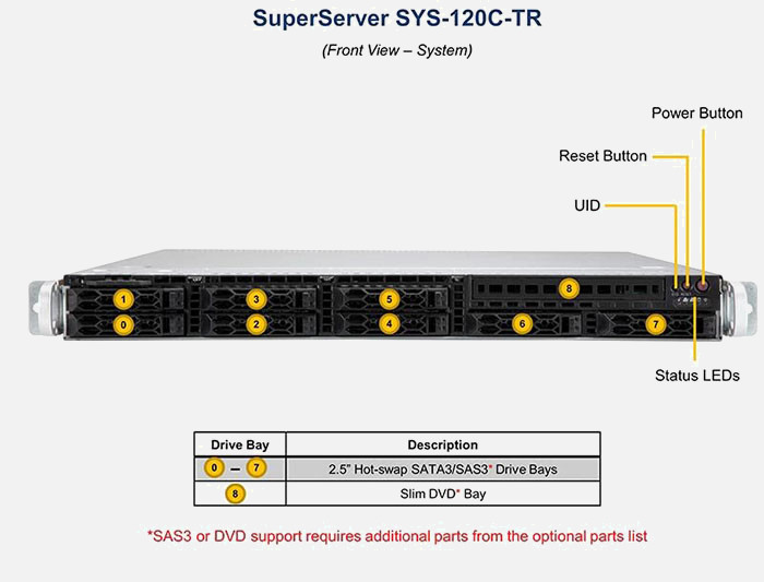 The Supermicro CloudDC SuperServer SYS-120C-TR can be configured with 2.5" drives, a more space efficient and low noise option. These drives also offer energy savings and increased flexibility.