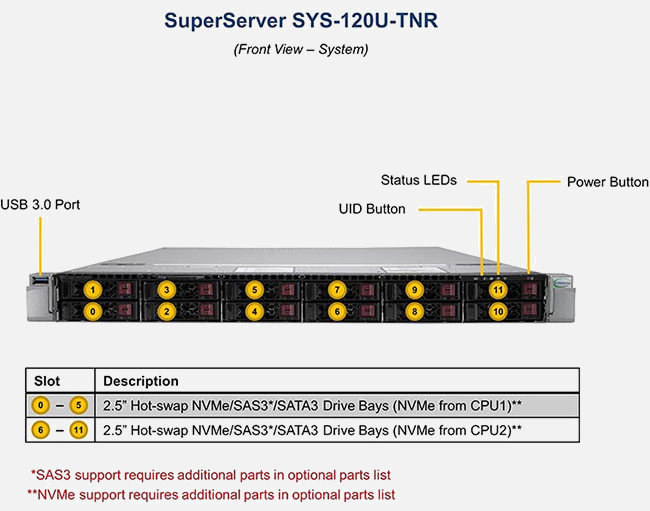 The Supermicro Ultra SuperServer SYS-120U-TNR | SYS-120U-TNR can be configured with 2.5" drives, a more space efficient and low noise option. These drives also offer energy savings and increased flexibility.