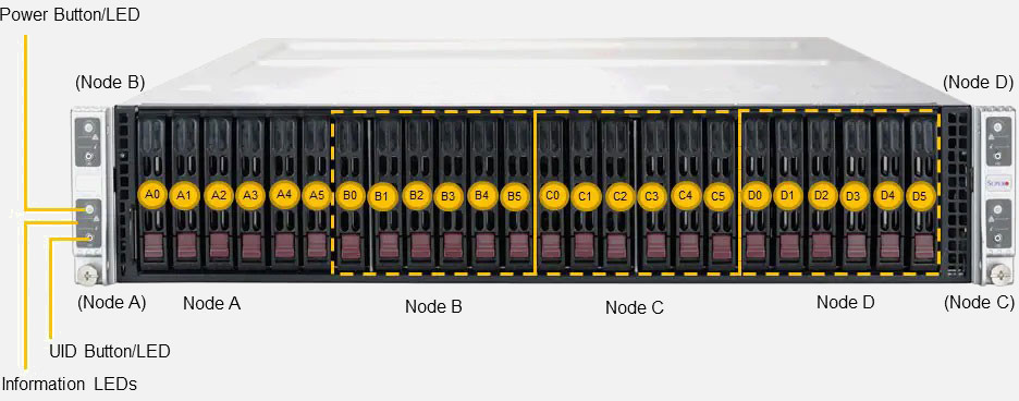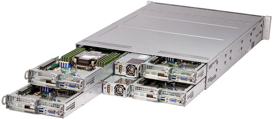 Ideal for Multi-Access Edge Computing, Telecom DRAN, CRAN, and Edge Core Application. Quad Node 2U Form Factor. Redundant 2000W DC Power Supply, 6x 2.5" hot-swap SATA drive bays (Per Node).
