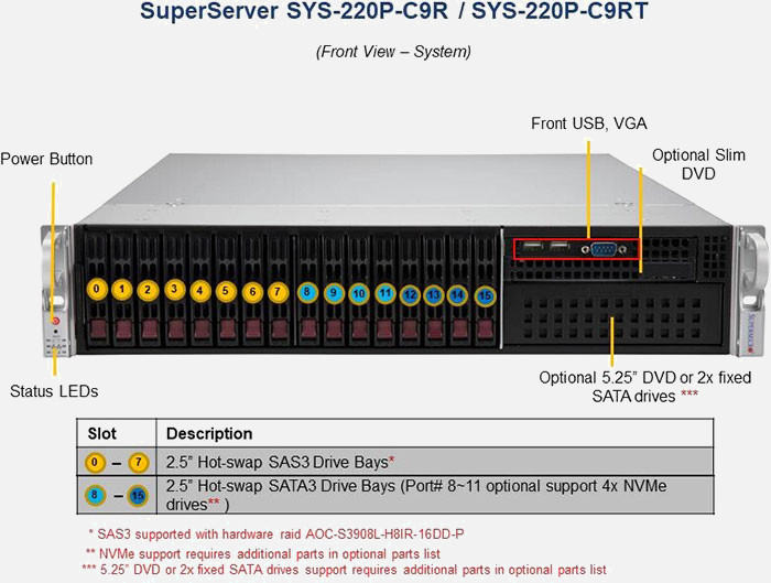 The Supermicro SuperServer SYS-220P-C9R | SYS-220P-C9R can be configured with 2.5" drives, a more space efficient and low noise option. These drives also offer energy savings and increased flexibility.