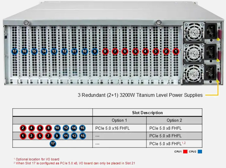 Dual Intel Xeon 6 6900 series Processor. Ideal for AI/Deep Learning Training & High Performance Computing. 8x PCI-E 5.0 x16 FHHL slot, 1x PCI-E 5.0 x16 FHFL Slot. 3200W Redundant Power Supply, 6x E1.S NVMe Hot swap drive bays.