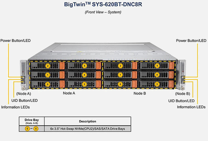 The Supermicro BigTwin SuperServer SYS-620BT-DNC8R | SYS-620BT-DNC8R features hot-swap hard drives, giving you more flexibility and allowing you to remove drives without having to shut down the system.