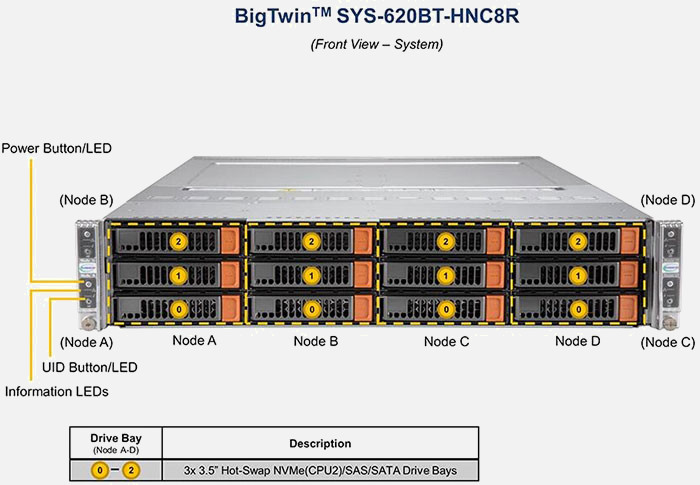 The Supermicro BigTwin SuperServer SYS-620BT-HNC8R | SYS-620BT-HNC8R features hot-swap hard drives, giving you more flexibility and allowing you to remove drives without having to shut down the system.