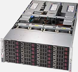Up to 6x Double Width Passive GPUs, 4-Way MP, 24x Hot-Swap 3.5" SAS3/SATA3 Drive Bays, 4x 10GBase-T LAN ports, Redundant Power Option.
